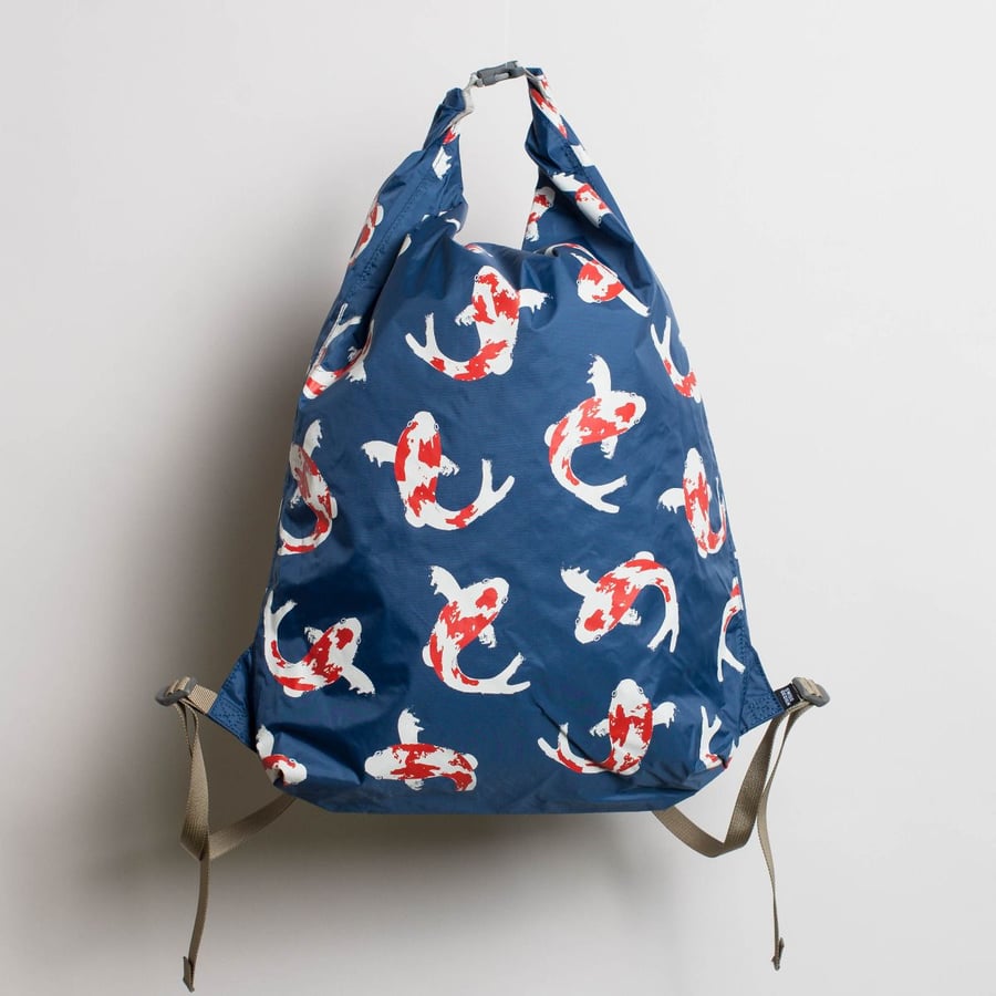Splash Backpack "Koi", 2023. Light weight and waterproof, Measurements: 390 mm x 580 mm, 2 color silkscreen, Colors: Red and white on marine, Designed by Büro Destruct. Small quantities!