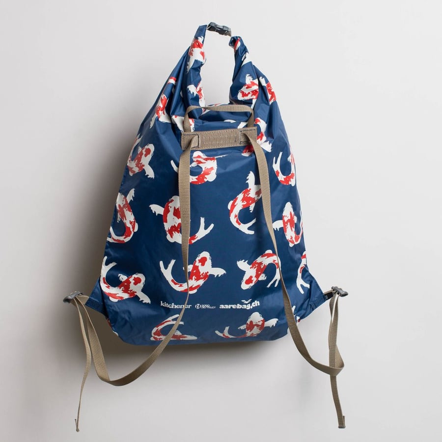 Wasserfester Rucksack "Koi", 2023. Superleicht und wasserfest, Masse: ca. 390 mm x 580 mm, 2-farbiger Siebdruck, Farbe: Rot und Weiss auf Marin, Design von Büro Destruct und produziert von Kitchener. Limitierte Auflage (und in der Regel rasch vergriffen)!