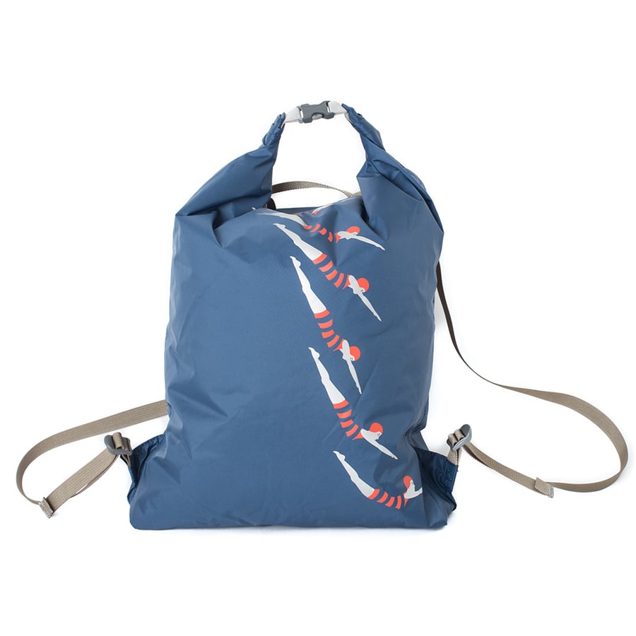 Splash Backpack "Turmspringerin" (Diver), 2020. Light weight and waterproof, Measurements: 390 mm x 580 mm, 2 color silkscreen, Colors: Red and white on marine, Designed by Büro Destruct. Small quantities!